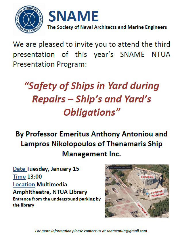 We would like to invite you to the third presentation in the SNAME NTUA Presentation Program this year. This Tuesday, January 15 at 13:00 in the Multimedia Amphitheatre of the NTUA Library, Professor Emeritus Anthony Antoniou and Lampros Nikolopoulos of Thenamaris Ship Management Inc. will speak about “Safety of Ships in Yard during Repairs – Ship’s and Yard’s Obligations”.
